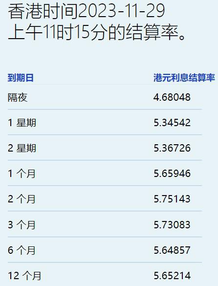11月29日,港元拆息偏软,但与楼按相关的一个月拆息连升九天,报5.65946%,续创逾16年新高,两个月拆息亦升至5.75143%,其他各期拆息则走低。隔夜息连跌两天,报4.68048%,为11月16日以来最低,三个月拆息结束八连升,由近23年高位回落至5.73083%。六个月及一年期分别降至5.64857%和5.65214%。