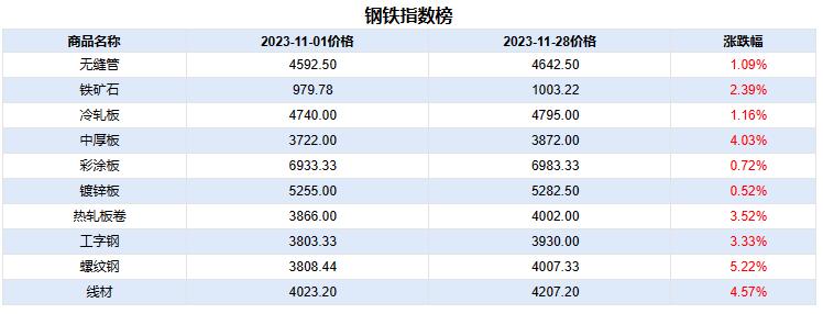 11月钢铁榜价格走势一览