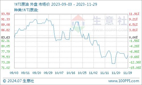 11月份国际原油价格走势下滑,截止月末时间,美国WTI原油期货主力合约结算价报76.41美元/桶,布伦特原油期货主力合约结算价报81.47元/桶,11月份原油价格走低5.69%。其一,经济数据不佳,消息面利空油价市场。美国通胀水平仍感到担忧,美联储表示未来仍可能会加息,美元上涨,以美元计价的大宗商品原油、黄金等价格承压;美国公布的多项经济数据都令市场对未来需求前景看淡,原油价格走低。其二,中东局势引发的供应紧张情绪有所缓解,由于中东地区季节性内部需求下降,导致其出口份额增加;北美欧洲地区用油旺季结束,需求面有所下滑,抑制原油市场。其三,美国原油库存增幅超预期,叠加市场对亚洲地区需求担忧情绪影响,利空因素影响,原油价格走势下滑,国内对二甲苯市场价格走低。
