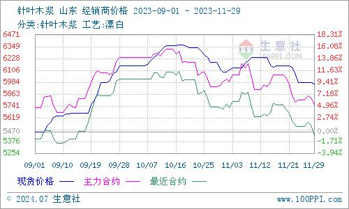 期货方面,11月29日上期所纸浆期货sp2401合约开盘价5818元/吨,最高价5848元/吨,收盘价5602元/吨,价格日跌幅3.78%,成交51.5万,持仓191,228手。