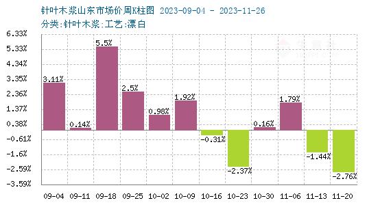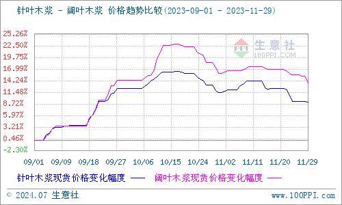 据生意社商品行情分析系统监测:11月针叶木浆和阔叶木浆价格仍表现出涨跌互现的状态。11月29日针叶木浆山东地区市场均价为5970元/吨,与11月1日均价6090元/吨相比下降了1.97%。11月29日阔叶木浆山东地区市场均价为5300元/吨,与11月1日均价5400元/吨相比下降了1.85%。