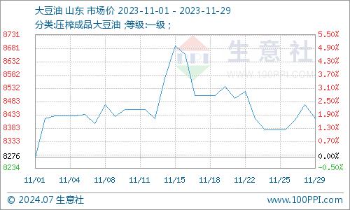豆油:11月,豆油行情先涨后跌,整体振荡上涨,涨幅接近1.8%。上旬,美豆油行情拉涨,加上终端刚性需求支撑,豆油现货行情大幅上涨,涨幅高达5%。下旬,外盘利空主导,美豆油行情下跌,豆油现货行情跟盘下跌,整体下跌超2.77%。