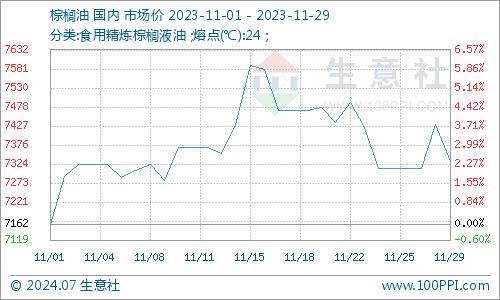 棕榈油:11月,棕榈油行情先涨后跌,整体振荡上涨,涨幅接近超2.3%。上旬,马盘棕榈油行情拉涨,加上终端刚性需求增加,棕榈油现货行情,涨幅高达5.98%。下旬,外盘利空主导,马盘棕榈油行情下跌,棕榈油现货行情跟盘下跌,整体下跌1.82%。