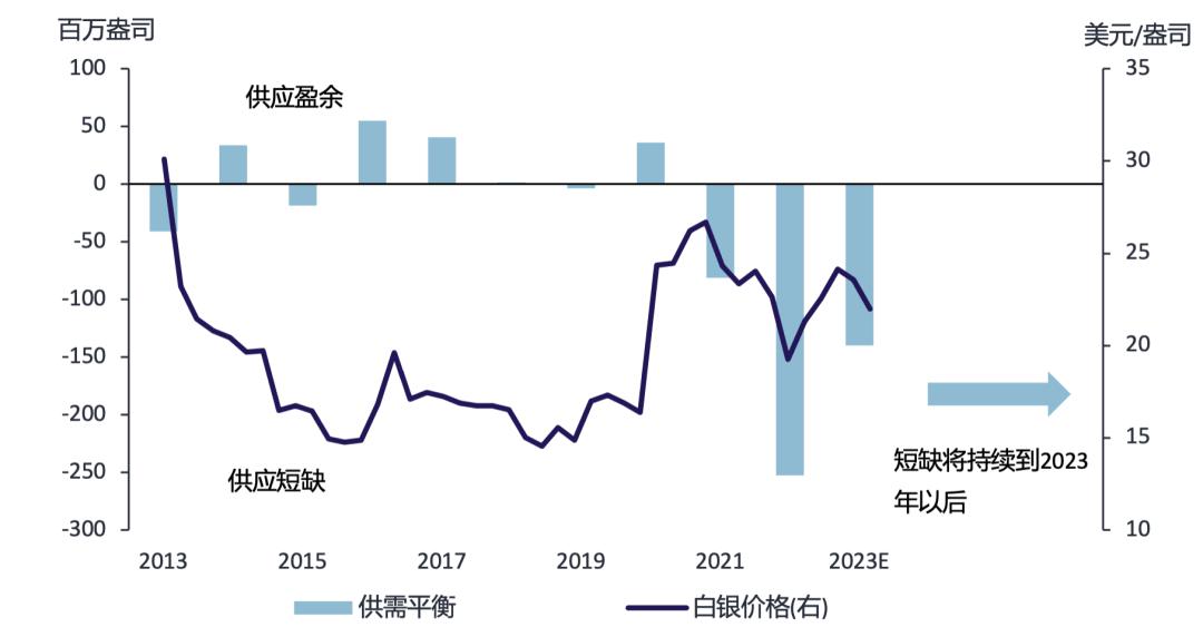 总体来看,2023年全球白银市场将再度出现大幅供应短缺,数量为1.4亿盎司,虽然较2022年创出的历史峰值低43%,但仍处于历史高位。作为背景信息,2010年之后十年期间的大部分时段内白银都供应过剩。就前景而言,Metals Focus预计在可预见的未来白银仍将供应短缺。