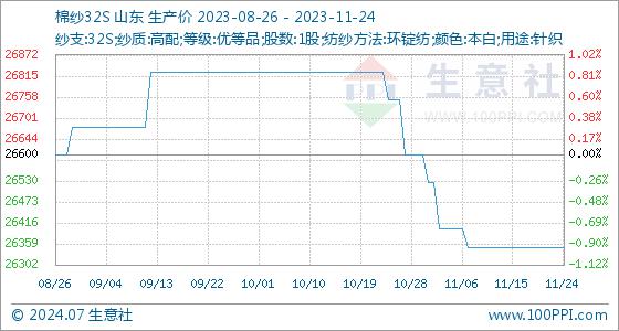 11月24日,生意社棉纱32S基准价为26350.00元/吨,与本月初(26525.00元/吨)相比,下降了-0.66%。