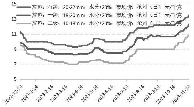 从历年红枣价格季节性特征看,红枣上市初期都会有一个提价过程,此阶段一般持续到11月中下旬至12月初。此阶段是红枣每年的采购旺季,前后分布在十一、双11、春节多个重要的节日,企业采购周期与下游居民消费周期重叠,因此,此时最为活跃,红枣价格也最易上涨。