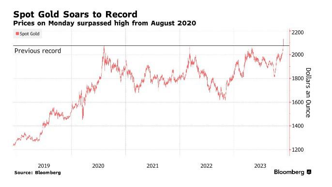 受疲软的美国经济数据和美联储官员对明年初降息预期的推动提振,黄金价格涨至创记录新高。周一亚市早盘,金价一度上涨3.1%,至每盎司2135.02美元,这超过了2020年8月7日在疫情期间创下的历史新高。截至发稿,金价涨约1%,报每盎司2093.21美元。