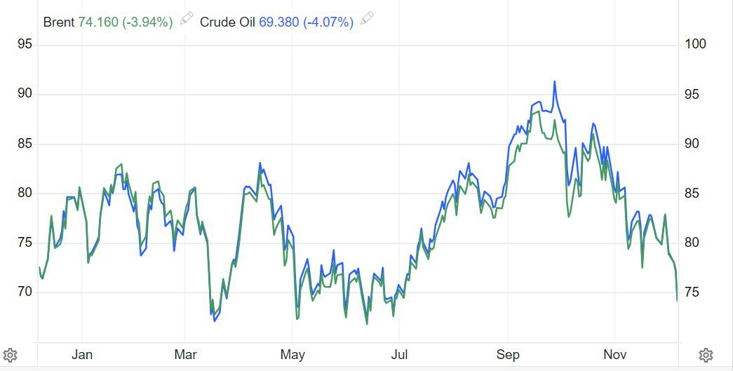北美原油定价基准——WTI原油期货价格在周三下跌超4%,跌破每桶70美元大关,收于6月底以来的最低水平,同时美国汽油零售价格在圣诞假日购物季和旅游季节到来之前触及1月份以来的最低点。数据显示,成交量最高的WTI原油1月期货合约下跌2.94美元,收于每桶69.38美元,跌幅高达4.07%;国际原油基准——布伦特原油2月期货合约下跌2.90美元,收于每桶74.16美元,跌幅达到3.94%。