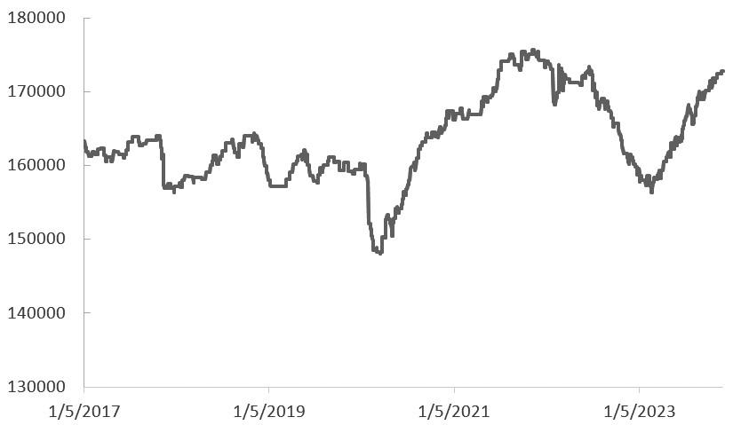 图为2017—2023年国内浮法玻璃在产日熔量(单位:吨)