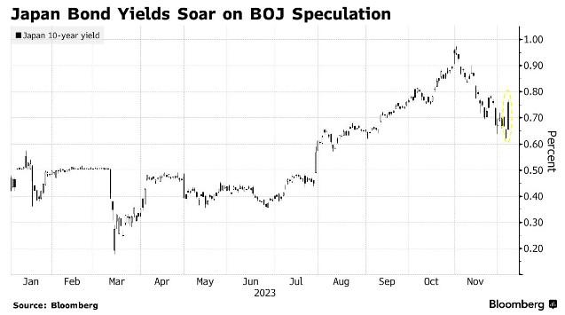 这一结果出炉前一周,日本央行行长植田和男及其副手的言论令金融市场震荡,因借贷成本可能更早结束低于零的状况。在暗示他们可能正在为政策转变做准备的情况下,日本债券收益率出现一年来最大涨幅,日元升值近4%,至1美元兑141.71日元的四个月高点。