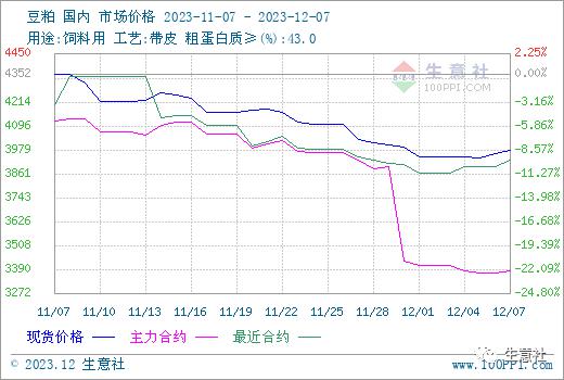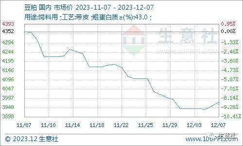 期货:11月7日以后,美豆全面上市,外盘美豆期价不断走低,加上南美大豆陆续进入播种期,外盘市场利空主导,连豆粕行情上涨乏力,弱势下跌为主,一直跌至月底,较月初下跌超6%。12月受降雨天气影响,南美大豆丰产预估增加,连豆粕行情大幅下滑,12月7日,连豆粕主力合约收3943元/吨,较11月7日下跌3.8%。期货行情打压,豆粕现货行情跟盘下跌。