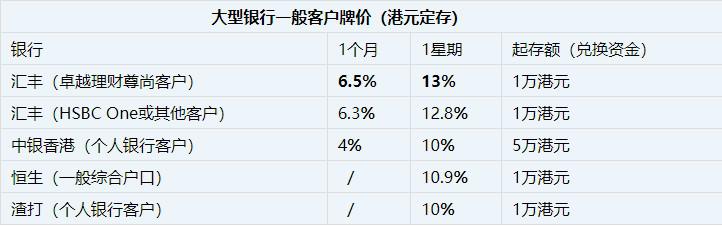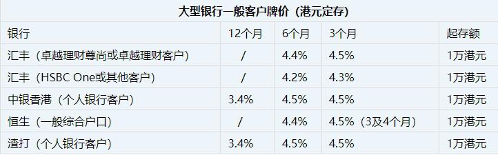 综合多间银行,目前6个月港元定存最高为4.9%,但起存门槛远高于汇丰等大行,例如华侨银行的4.9%及南洋商业银行的4.9%,均需为理财客户的100万港元新资金。以1万港元起存的低门槛而言,汇丰等4大银行的4.4%属较高水平。