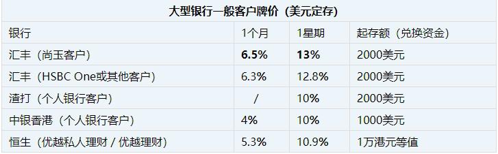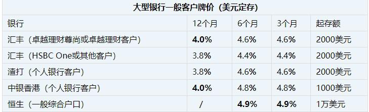 有调查指,近8成投资者估计美国加息已经见顶,美元定期存款有下降趋势,近日4大银行均先后下调美元存息,最高年利率一律跌穿5%。早前汇丰的美元短息也随港元下调,汇丰的1个月美元定存下调至6.5%,1星期维持最高13%不变。