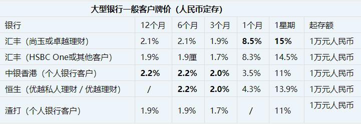 汇丰下调美元存息后,美息与港息的差距拉近至仅0.1%。例如目前汇丰的3个月港元定存有4.5%,美元定存为4.6%。近期汇丰及恒生都有加人民币存息,年利率加至2%以上。而汇丰同样大加短息,1星期最高15%。