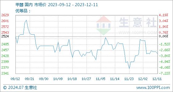 12月11日,生意社甲醇基准价为2450.00元/吨,与本月初(2510.83元/吨)相比,下降了-2.42%。