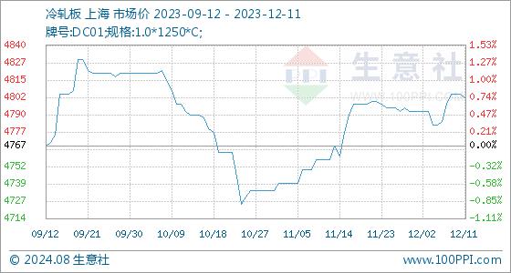 12月11日,生意社冷轧板基准价为4805.00元/吨,与本月初(4792.50元/吨)相比,上涨了0.26%。