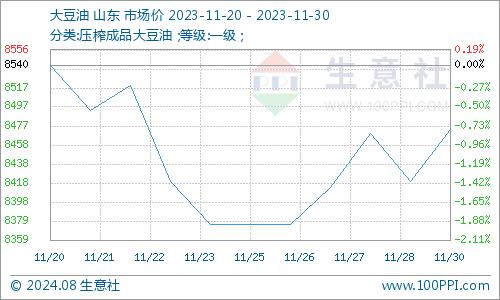 据生意社商品行情分析系统显示:11月20日起,利空打压,豆油棕榈油行情振荡下跌。11月20日,豆油市场均价8540元/吨,11月30日,豆油市场均价8474元/吨,跌幅0.77%。11月20日,棕榈油市场均价7478元/吨,11月30日,棕榈油市场均价7372元/吨,下跌1.42%。