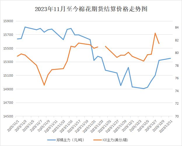 期货方面,国内新棉收购近尾声,成本固化,短期对盘面形成一定支撑,加上外盘大涨,内外联动下近期郑棉连续多日上涨。截至11日,郑棉主力合约结算价15350元/吨,较月初上涨2.8%。ICE期棉方面,谷物大涨下叠加出口数据好转,主力合约7日大幅上涨,但USDA12月供需报告调减全球消费量,数据不佳期棉下跌,截至8日,主力合约结算价81.44美分,较月初上涨2.5%。