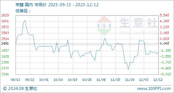 12月12日,生意社甲醇基准价为2441.67元/吨,与本月初(2510.83元/吨)相比,下降了-2.75%。