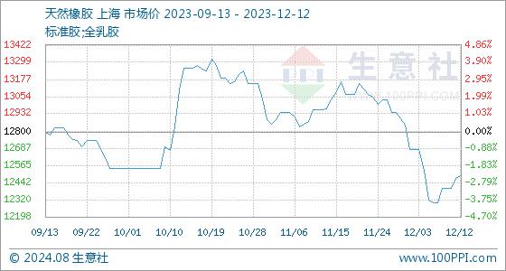12月12日,生意社天然橡胶基准价为12470.00元/吨,与本月初(12850.00元/吨)相比,下降了-2.96%。