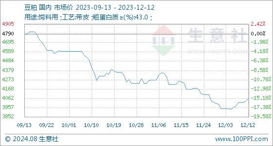 12月12日,生意社豆粕基准价为4032.00元/吨,与本月初(3992.00元/吨)相比,上涨了1.00%。