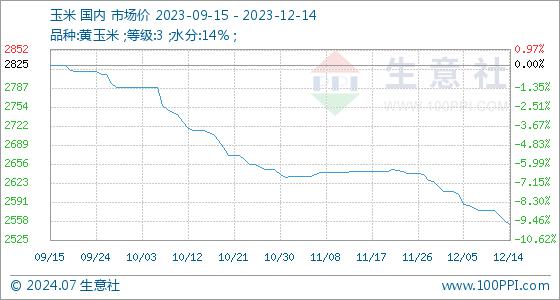 12月14日,生意社玉米基准价为2558.57元/吨,与本月初(2617.14元/吨)相比,下降了-2.24%。