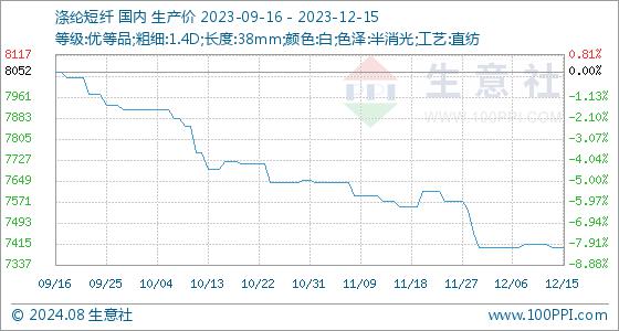 12月15日,生意社涤纶短纤基准价为7402.00元/吨,与本月初持平。