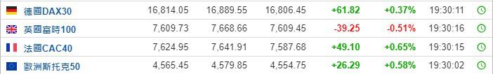 2. 截至发稿,德国DAX指数涨0.37%,英国富时100指数跌0.51%,法国CAC40指数涨0.65%,欧洲斯托克50指数涨0.58%。