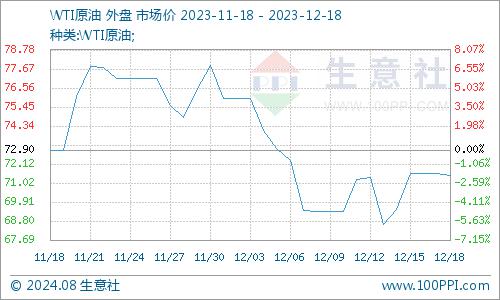 原油市场震荡调整,12日原油价格重挫,行至最近六个月低点,主因美国通胀数据意外上升,令市场对美联储明年年初降息的预期走低,叠加市场对供应过剩担忧。随后,美元走软拉升油价估值,叠加国际能源署(IEA)上调明年石油需求预测,油市获得提振。截止12月15日,美国WTI原油期货主力合约结算价报71.43美元/桶,布伦特原油期货主力合约结算价报76.55元/桶。