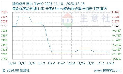 据生意社商品行情分析系统,近期国内涤纶短纤市场行情小幅走弱,截止12月18日江浙主流工厂1.4D*38mm均价在7382元/吨,较12月11日下跌0.40%。