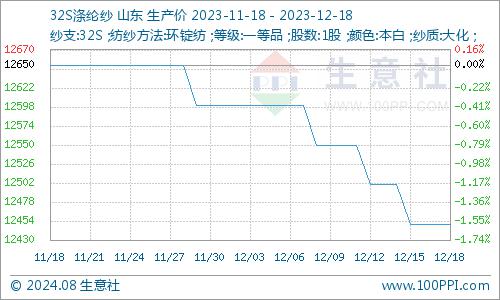 终端纺织需求仍处淡季,纱厂出货阻力大,当前各地区纱厂开机率稳中有降。新疆大型纱厂平均仍可达八成左右,河南大型企业平均在60%左右,中小型纱厂在50%左右。江浙、山东、安徽沿江地区的大型纱厂平均开机在65%,中小型纱厂开机在50%。累库风险犹存,对涤纶短纤采购意愿低。价格方面,截止12月18日,山东地区纯涤纱市场参考价格报12450元/吨,持续小幅下滑。