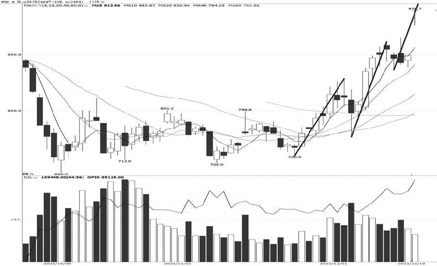 周线上,集运欧线2404合约上周强势整固,收出阴十字K线,从底部收敛形态突破以来已经连续上涨4周。日线上,前一个交易周中收出四阴一阳,上下影线均较长,显示多空分歧较大,期价通过区间整理基本修复了之前均线较大的乖离率。本周一开盘涨停,盘中虽有短线调整,但基本看不出空头有力的反击。结构上,从本轮涨势起涨位置算起,目前已处在第三波上涨行情之中。综合看,期价短期维持强势。操作上,低位多单可以分批离场,不宜过分追涨。