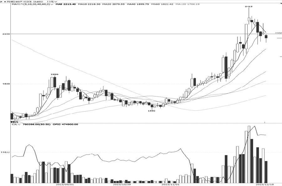 纯碱主力2405合约自10月27日当周见底1592元/吨后,连续七周重心上移,期价最高上摸2413元/吨高点,上周展开调整,本周一最低触及5周均线2130元/吨附近支撑。日线上,期价已连续3日收在10天均线下方,当前重要压力位在2200元/吨附近,下方支撑在前期成交密集区中枢2130元/吨上下。从短期均线看,5日、10日均线有望出现死叉下行,向20日均线逐渐收敛。综合看,期价延续调整。操作上,空单可以滚动操作,遇急跌择机减仓。(中原期货 李卫红)