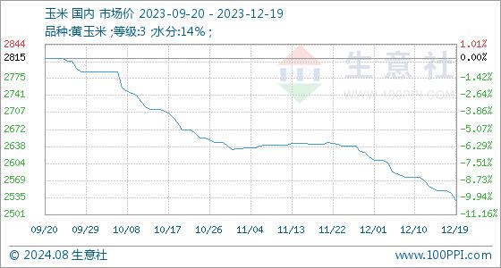 12月19日,生意社玉米基准价为2544.29元/吨,与本月初(2617.14元/吨)相比,下降了-2.78%。