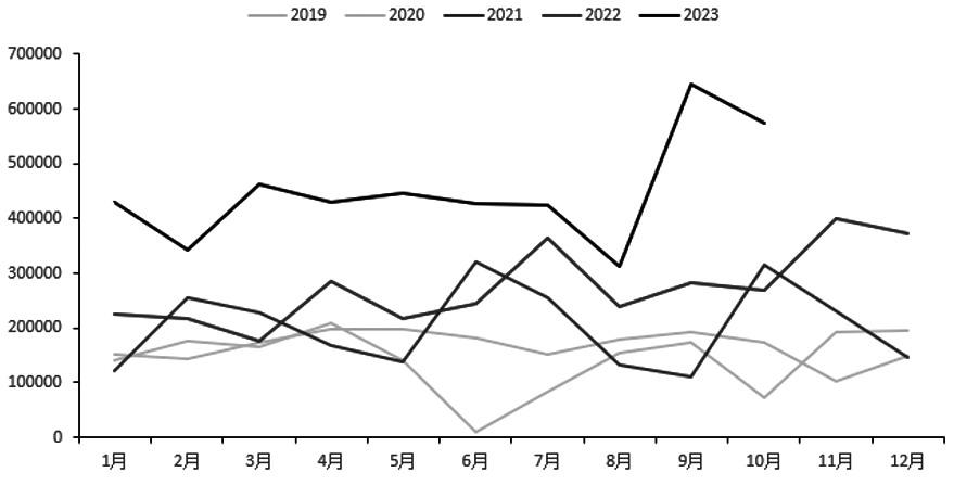 图为辉石月度净进口量(单位:吨)