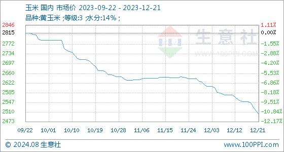 12月21日,生意社玉米基准价为2515.71元/吨,与本月初(2617.14元/吨)相比,下降了-3.88%。
