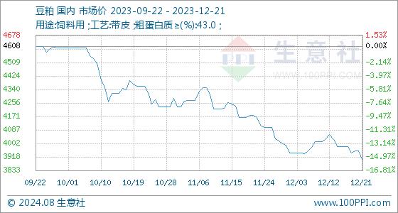 12月21日,生意社豆粕基准价为3956.00元/吨,与本月初(3992.00元/吨)相比,下降了-0.90%。