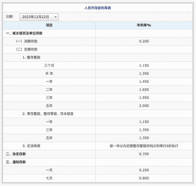 中国银行官网显示,该行于12月22日下调人民币存款利率,其中定期整存整取三个月、半年和一年期利率均下调10个基点,一年期利率降至1.45%;二年期下调20个基点至1.65%;三年期和五年期均下调25个基点,分别至1.95%和2.00%。
