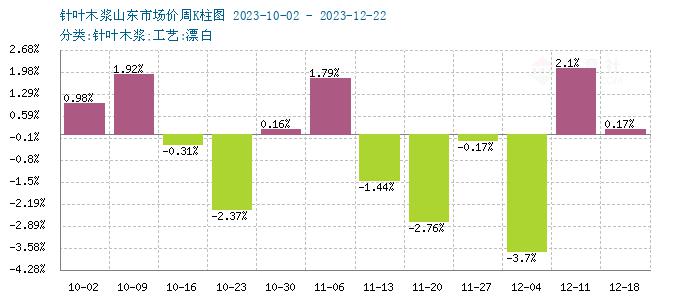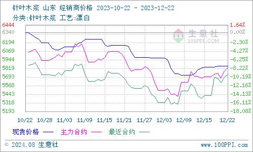 据生意社商品行情分析系统监测:本周针叶木浆和阔叶木浆价格持续涨跌互现。12月22日针叶木浆山东地区市场均价为5850元/吨,与12月17日均价5840元/吨相比上涨了0.17%。12月22日阔叶木浆山东地区市场均价为5030元/吨,与12月17日均价5040元/吨相比下降了0.2%。