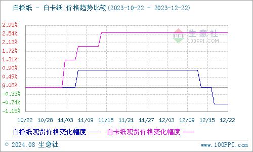 下游白卡纸价格持续平稳,12月22日白卡纸230g-400g市场均价为5240元/吨,由于终端需求改善不大,市场后市信心缺乏提振,而原料木浆价格仍处于高位,白卡纸成本压力仍存,价格继续稳市为主。灰底白板纸价格本周仍有走低,12月22日灰底白板纸250g市场均价为4099元/吨。当前贸易商库存量较高,导致纸厂出货承压,而下游市场需求欠佳,多维持刚需补库为主,市场供需矛盾格局凸显,价格不断走低。