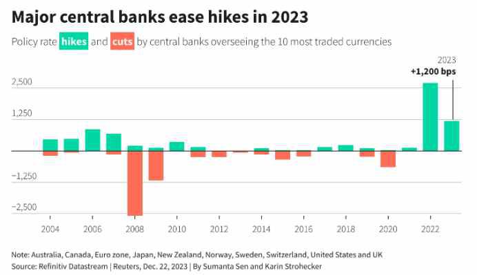 整个2023年,全球大部分央行仍处于紧缩周期,但步伐有所放缓。统计数据显示,过去12个月,监管10种交投最活跃货币的央行共加息38次,收紧幅度达1200个基点,小于2022年54次加息,收紧幅度2700个基点。
