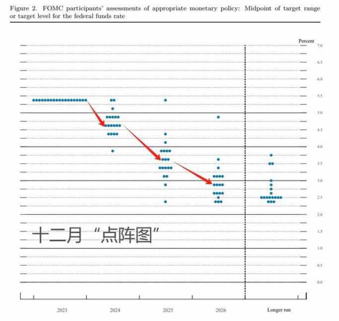 最新点阵图显示,FOMC委员们对2024年的政策利率中位预期为4.6%,隐含着明年降息75个基点的含义。作为对比,今年9月的点阵图中,FOMC委员们对明年联邦基金利率的中值预期为5.1%。