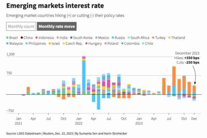 自今年年初以来,新兴市场央行合计收紧了5075个基点,相比之下,2022年全年的加息幅度高达7425个基点。