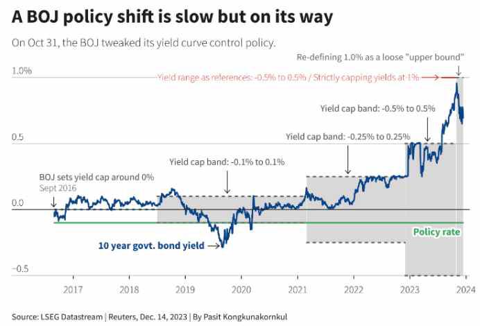 在12月议息会议后,日本央行行长植田和男再次发表言论表示,实现央行通胀目标的可能性正在“逐步上升”,如果可持续实现2%通胀目标的前景“充分”,日本央行将考虑改变政策。这是日本央行迄今为止有关结束超宽松货币政策可能性的最明确信号。