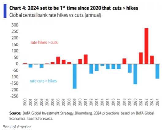 根据美国银行的经济学家预测,2024年全球央行将降息152次,这是自2020年以来的最多降息次数。