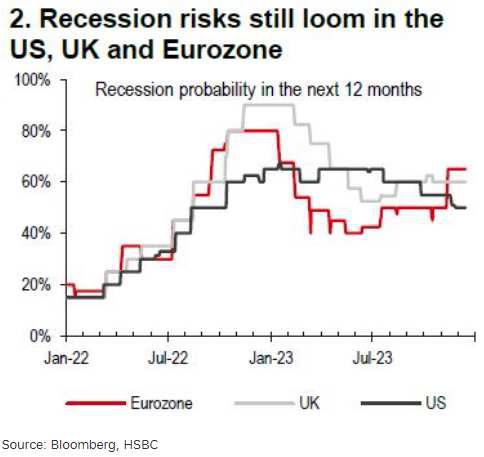 目前,欧洲央行已将今年的经济增长预测从0.7%下调至0.6%,将明年的增长预测从1%下调至0.8%。英国央行则预计,今年第四季度和未来几个季度英国经济将“基本持平”。市场认为英国和欧元区经济将陷入衰退的可能性也高于美国。
