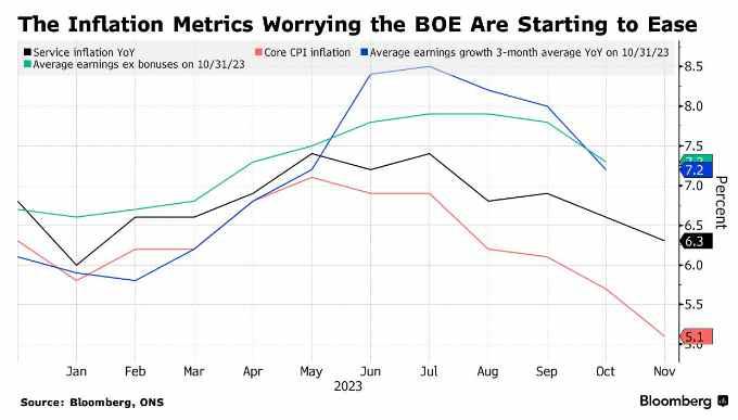 同样身处欧洲的英国也面临能源问题,加上食品通胀、薪资方面等压力,这使得该国一直面对着七国集团中最高的通胀率。但10月以来,英国CPI持续大幅降温,能源、食品价格下降推动整体通胀放缓,最新数据显示,英国11月CPI同比上涨3.9%,创下2021年9月以来最低同比涨幅。剔除食品和燃料后的核心CPI同比涨幅为5.1%。