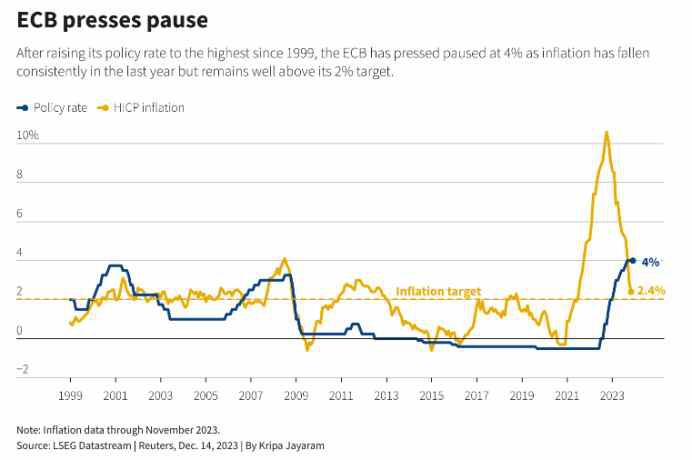 今年,欧洲央行选择跟随美联储放缓加息步伐,前3个季度连续加息6次,累计加息175个基点,直到10月才暂停加息。