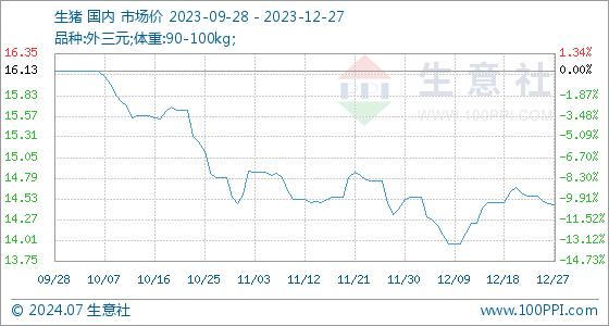 12月27日,生意社生猪基准价为14.47元/公斤,与本月初(14.53元/公斤)相比,下降了-0.41%。