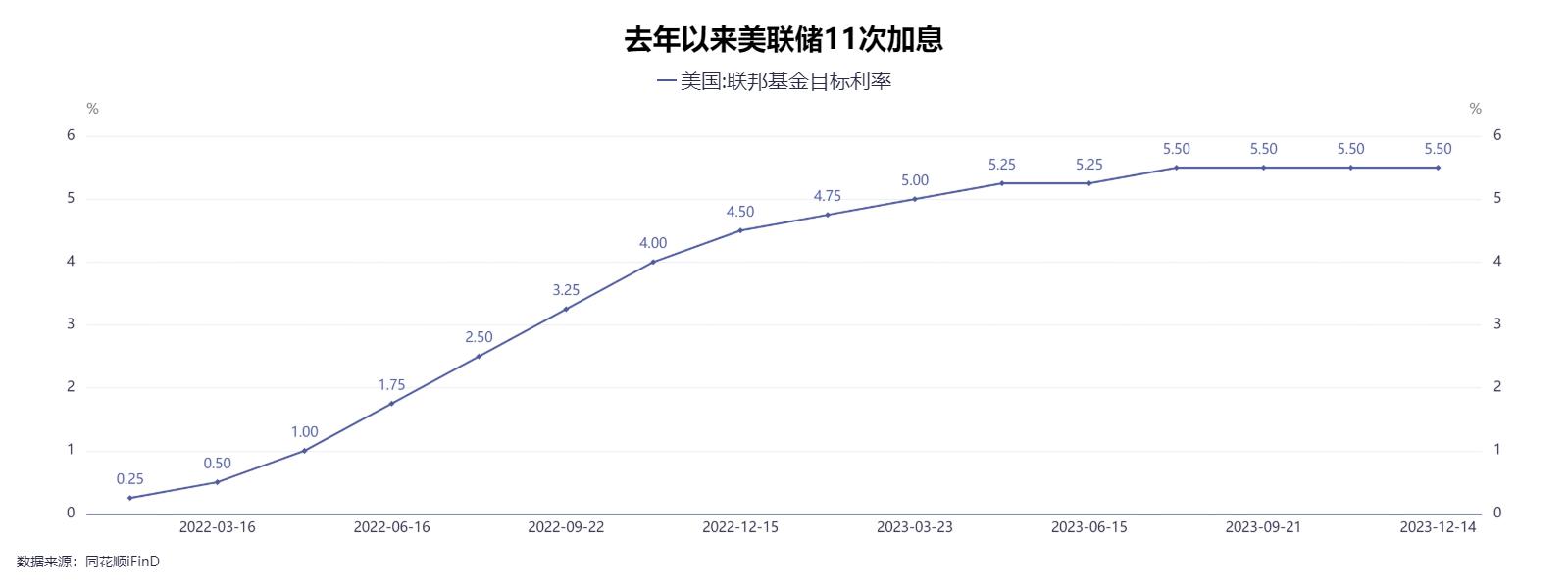 回顾此轮加息历程,从2022年3月至今,美联储本轮加息周期共加息11次,幅度从最开始的25个基点,到后来的50个基点,以及连续4次75个基点,后来加息幅度又逐步放缓。